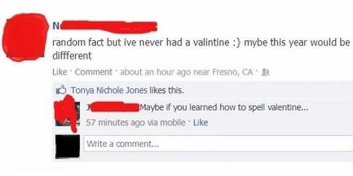 Tout le monde n’a pas de rendez-vous pour les fêtes, et les réseaux sociaux sont un endroit courant pour s’en plaindre. Un utilisateur s’est lamenté de n’avoir jamais eu de « Valintine » dans sa vie. Un commentateur serviable a fait remarquer qu’il aurait peut-être plus de chance s’il apprenait à épeler le mot correctement.