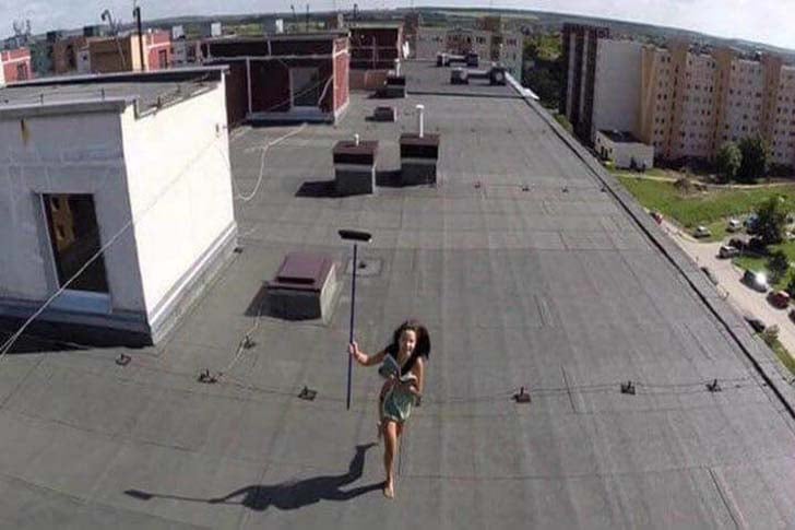 Tomar el sol en la azotea no es una mala idea si quieres tomar aire fresco y broncearte, pero significa que vendrán invitados no deseados. Bueno, esta mujer tiene una solución para los visitantes no deseados. Ella persigue el dron con una escoba en la mano o simplemente le lanza la escoba. La foto captura ese divertido momento.