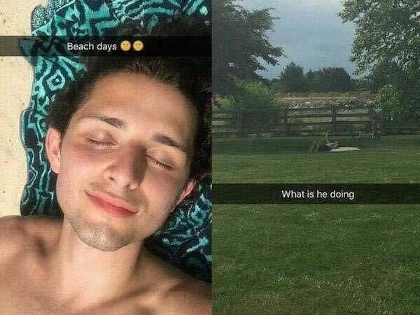 Desafortunadamente para él, un transeúnte lo captó en el acto de tomarse un selfie en un ángulo extraño. Le tomaron una foto “entre bastidores”, revelando que en realidad estaba tratando de hacer que su entorno mundano pareciera un día relajante en la playa.