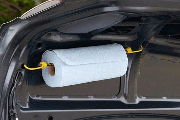 By attaching an elastic cord to the lid of the trunk, you can hang paper towels there and leave them in easy reach whenever you need them. It’ll make car maintenance easier than ever.