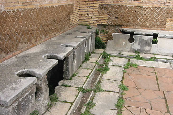 Dans la Rome antique, aller aux toilettes était une activité sociale. Les gens s’asseyaient côte à côte sur des bancs publics, sans cloisons, tout en discutant tranquillement. Le papier toilette n’existait pas non plus — on utilisait des bâtons enveloppés de tissu, des feuilles, ou même des éponges.
