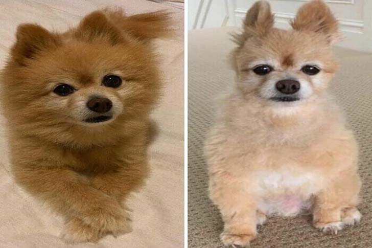 一瞬のうちに、このポメラニアンはかわいくてふわふわしていたのに、まるで一世一代の戦いを経験したかのような姿になってしまった。10歳ほど老けて見えるだけでなく、なぜか毛色もすっかり変わってしまった。また、かなり幸せそうな犬から、悲しそうで苦しそうな犬になった。簡単な散髪でこんなに変わるなんて、おかしいと思わないか?