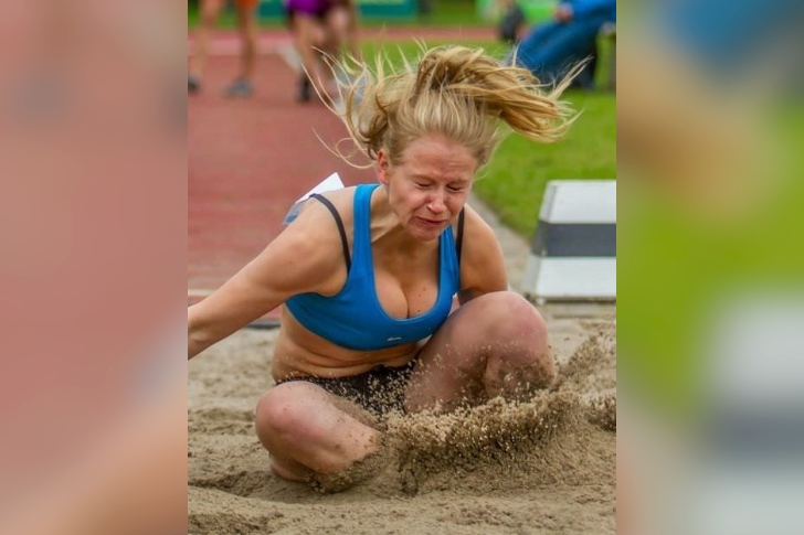 This track-and-field star isn’t just sticking the landing—she’s bracing for the sandy tsunami heading straight for her face! The photo freezes the exact moment physics and comedy collide: her eyes squeezed shut, lips pursed, and a storm of sand mid-blast like a desert explosion. You can almost hear her internal monologue: “Not the teeth… NOT THE TEETH!”