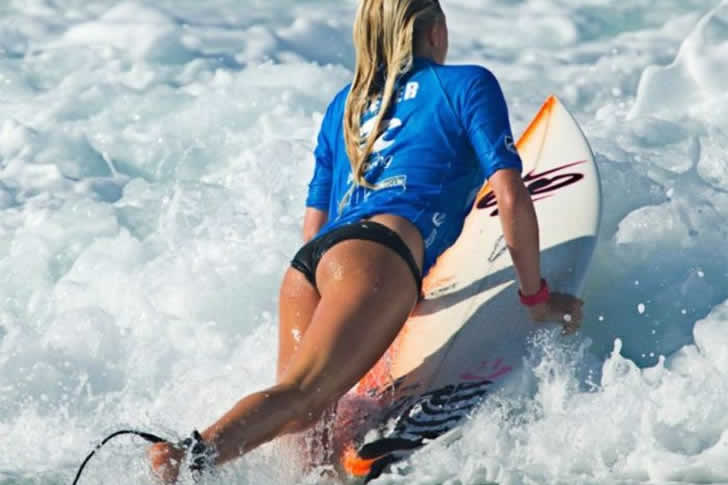 Caricando dritta tra le onde spumeggianti, sembra una che fa sul serio. Con una tavola da surf e un fisico che urla dedizione, questa foto potrebbe facilmente fungere da pubblicità per un campionato di surf. Che si stia preparando per un’onda micidiale o stia praticando le sue abilità di pagaiata, non c’è modo di confondere il livello di fiducia e concentrazione qui.