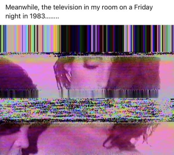 Questo meme si riferisce all’era della TV via cavo “scrambled” (codificata) degli anni ’80, quando i canali premium erano distorti in un caotico miscuglio di statico e colori sfasati se non avevi un abbonamento. L’umorismo risiede nell’esperienza condivisa degli adolescenti che fissavano disperatamente lo schermo, cercando di “decodificare” sagome o forme deboli attraverso il rumore visivo.
