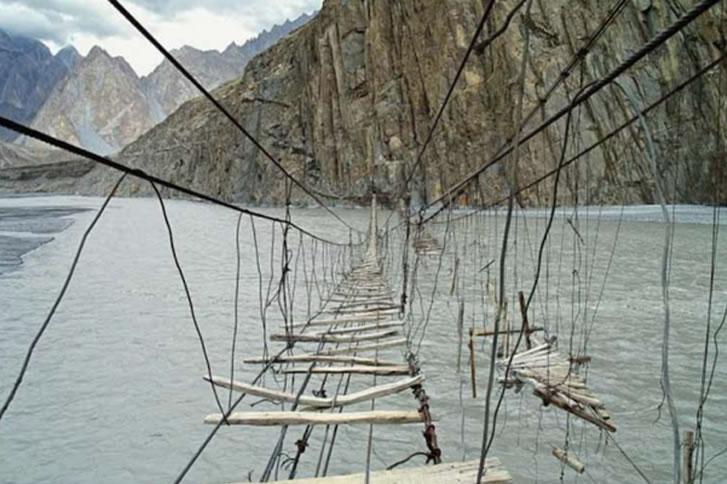 パキスタンに位置するフセイニ吊り橋は、その危険性から一見して渡ることを躊躇わせる橋です。この橋はフセイニ村にあるため、その名で呼ばれています。橋はかなり長く、足元の板の間隔も広いため、足下を通る風が恐怖を増幅させます。また、橋の入口には注意書きがあり、同時に7人までしか渡れないとされています。