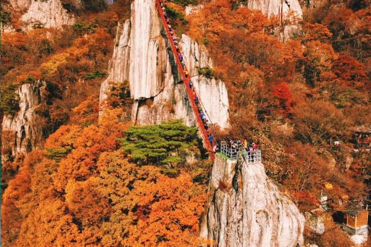 韓国の大屯山(テドゥンサン)は、標高880フィート(約880メートル)で、雲橋は険しい地形から243フィート(約74メートル)の高さに位置しています。この山は、韓国でトレッキングが楽しめる山の一つとして知られ、素晴らしい景観を提供しています。絵画のような美しい緑の風景が広がっており、ハイキングの体験を忘れられないものにしてくれるでしょう。
