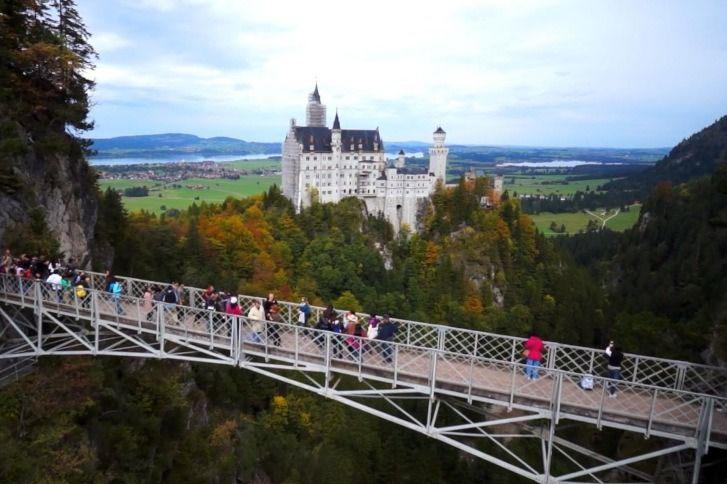 マリエンブリュッケ(別名:メアリー女王の橋)は、ノイシュヴァンシュタイン城の絶景を望むための絶好の場所として知られています。この歩道橋からは、城の壮大な景観を捉えることができ、多くの観光客が訪れます。橋までのハイキングは約45分で、少し体力を要するため注意が必要です。
