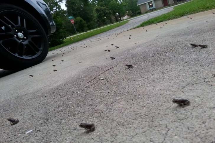 雨があがり、辺りには静けさが漂っています… ですが誰かが玄関の外に出たとき、とてもショッキングな光景が目に飛び込んできました。カエルがいたるところにいて、地面を覆っているではないですか。しかし、不思議なことに彼らは動いていません。それどころか、カエルは等間隔で同じ方向を向いているのです。カエルの神様に祈っているのか、それともカエルの儀式に参加しているのか。それはわかりませんが..