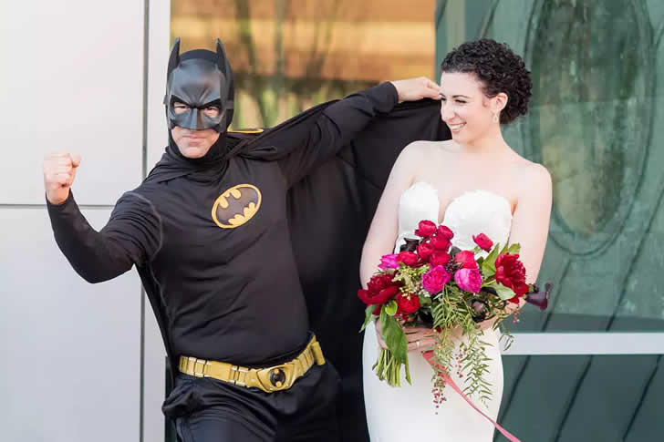 彼を写真から外すのではなく、皆がこれを絶好のシャッターチャンスだと認識し、一緒に楽しむよう誘いました。自分の結婚式の日にバットマンが偶然現れたと語れる人が他にいるでしょうか?歓迎されないサプライズゲストもいますが、一瞬だけでも両手を広げて歓迎すべきゲストもいるのです。