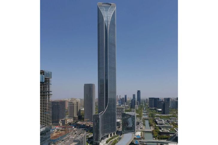 Surplombant le lac Jinji, cette tour de 450 mètres et 95 étages a été achevée en 2019 à Suzhou, Chine.
