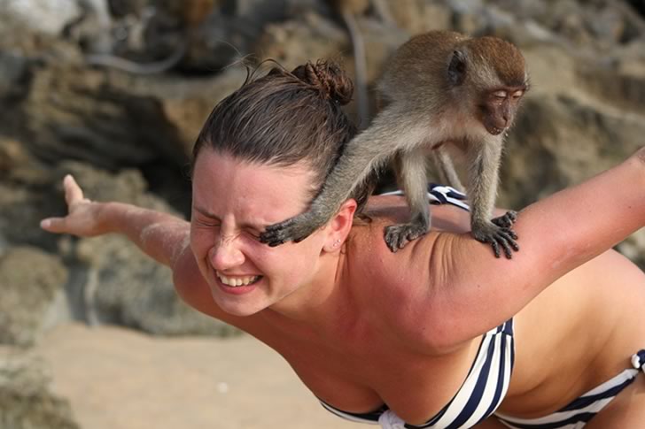 Une femme tente la classique pose « avion » sur la plage, les bras tendus, les yeux fermés de bonheur — jusqu’à ce qu’un singe sauvage lui saute sur le dos et lui applique une gifle en pleine figure. Le singe a l’air légèrement contrarié, comme s’il l’avait prise pour un Uber avec de meilleures collations.