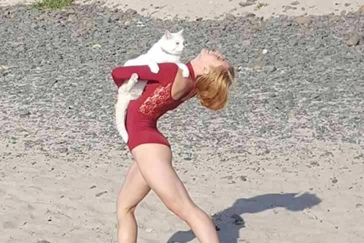 Si vous êtes propriétaire d’un chat, vous savez que les chats ont une étrange fascination pour le sable. Après tout, c’est pratiquement leur litière naturelle. Mais sur cette photo, le sable rencontre l’élégance. Une danseuse prend une pose magnifiquement équilibrée sur la plage, mais tous les regards sont tournés vers Buns – le chat magnifique et curieux qui vole la vedette.