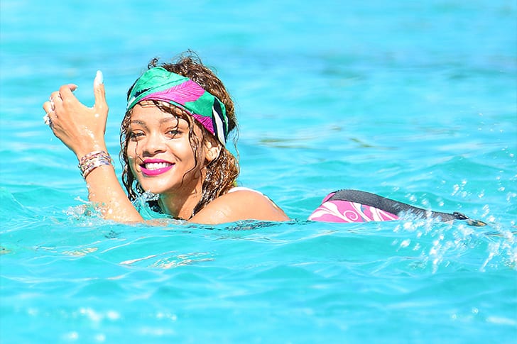 In 2013, Rihanna returned to her roots to enjoy a vacation in her hometown of Barbados. Known for its stunning beaches, vibrant culture, and warm hospitality, Barbados is a Caribbean paradise. In this photo from her trip, Rihanna is seen dipping in the crystal-clear waters, sporting a colorful bandana and swim set.