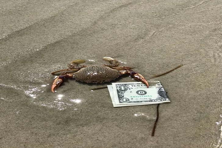 Pelo jeito, esse caranguejo tá fazendo algum tipo de negócio com um humano. Tipo, talvez o caranguejo esteja pensando: “Pega essa grana minha aí e me arruma uma parceira caranguejo maneira”.