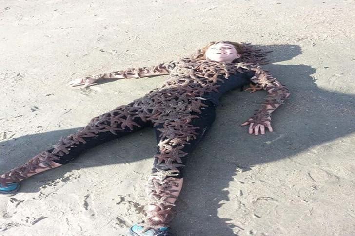 Alguém encontrou uma mulher coberta de estrelas-do-mar na praia. De acordo com essa mulher, ela apenas usou a grande quantidade de estrelas-do-mar que foram encontradas na praia.