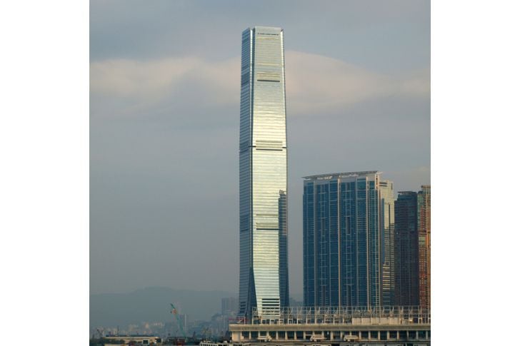 Com 484 metros e 108 andares, esta torre foi concluída em 2010 em Hong Kong, China.