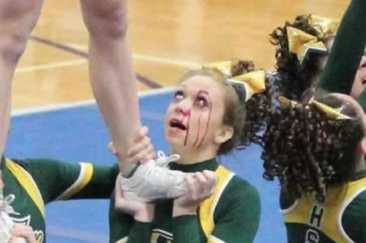 Esta cheerleader mostra um verdadeiro espírito de equipe: apesar de uma lesão facial, ela continua – sangrando, mas sorrindo. Uma acrobacia claramente deu errado, mas ela permanece corajosa no palco.