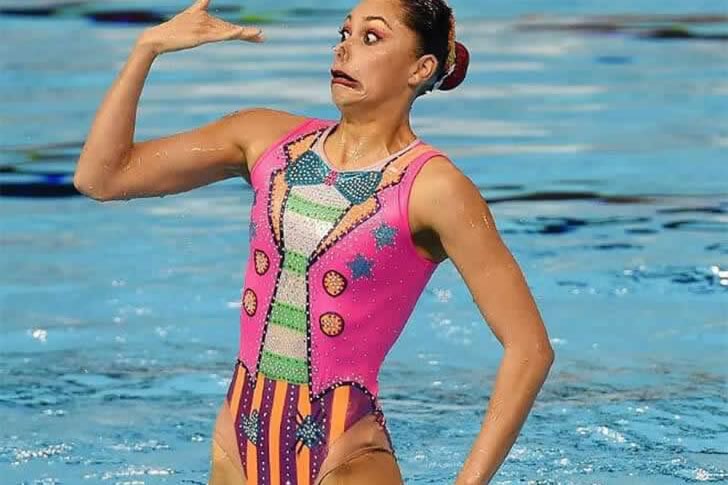 Neste momento hilário, a natação sincronizada se transforma em teatro: uma atleta em um maiô colorido finge que um tubarão está mordendo seu rosto.