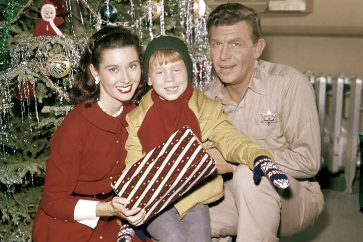 This 1960 holiday promo photo features Elinor Donahue, Ron Howard, and Andy Griffith promoting The Andy Griffith Show. The beloved series won over audiences nationwide with its heartwarming portrayal of small-town life. Andy Griffith played Andy Taylor, a widowed sheriff managing both his duties and raising his young son in the fictional town of Mayberry, North Carolina.