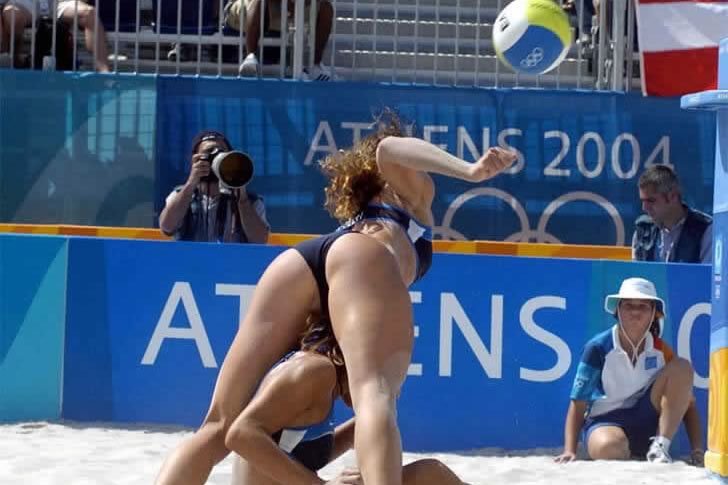During the scorching heat of the 2004 Athens Olympics, a volleyball player dives over her seated teammate — a moment full of dynamism, frozen perfectly.