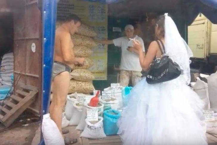 Some couples dream of lavish ceremonies in grand venues, but these newlyweds chose an unconventional route. Their nuptials unfolded amidst sacks of grain and flour, far from any traditional setting. The groom, taking minimalism to a new level, opted for his underwear rather than a suit, redefining wedding attire.